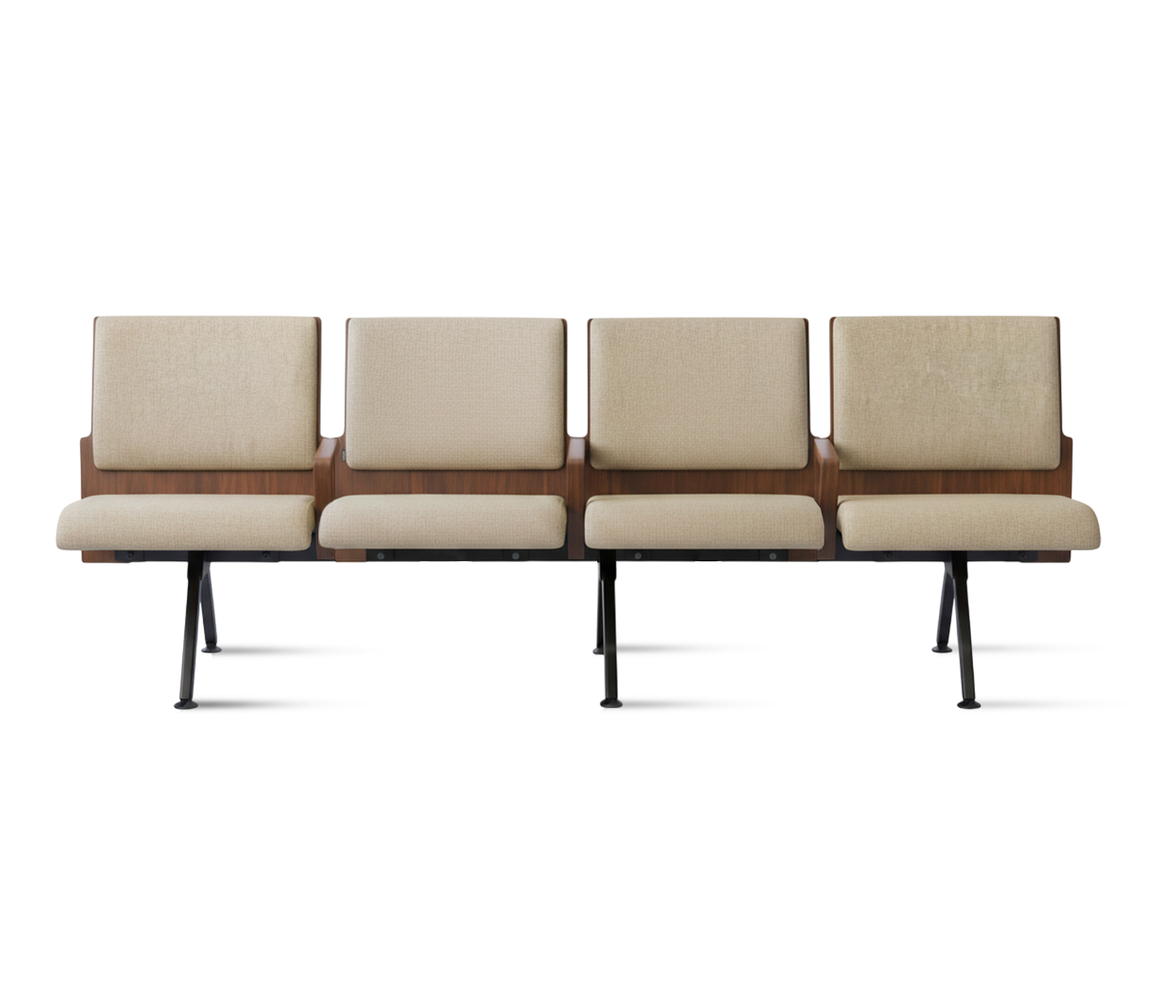 このロビー用待合椅子は、耐久性の高い曲げ木合板の座面に、高品質の天然木突板を貼り、傷に強いPUコーティングを施しています。さらに、背もたれと座面のクッションにはPVCレザー張りのフォームを使用し、快適な座り心地を実現しています。幅広の座面は高級感を演出し、パブリックスペースのクオリティを高めます。