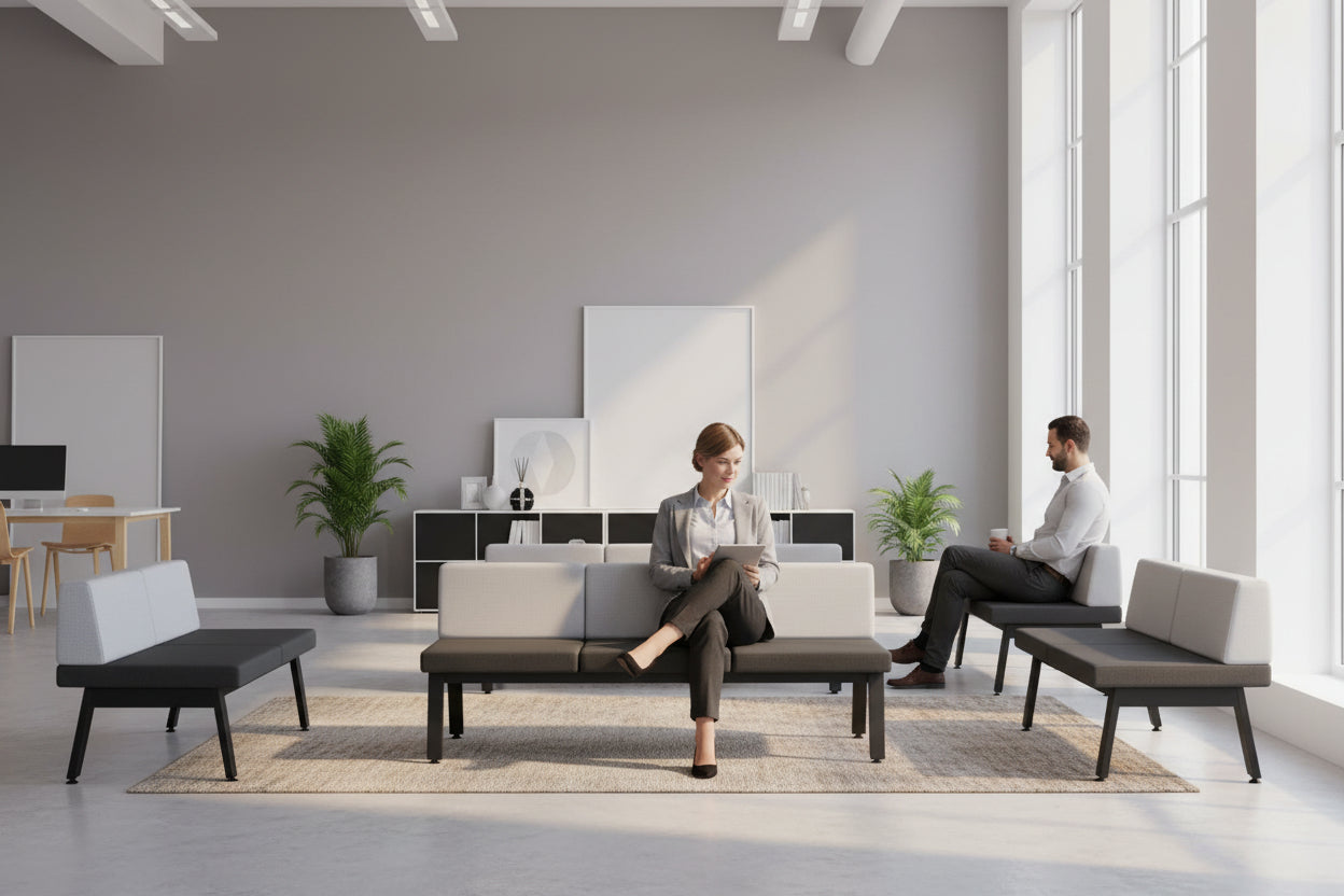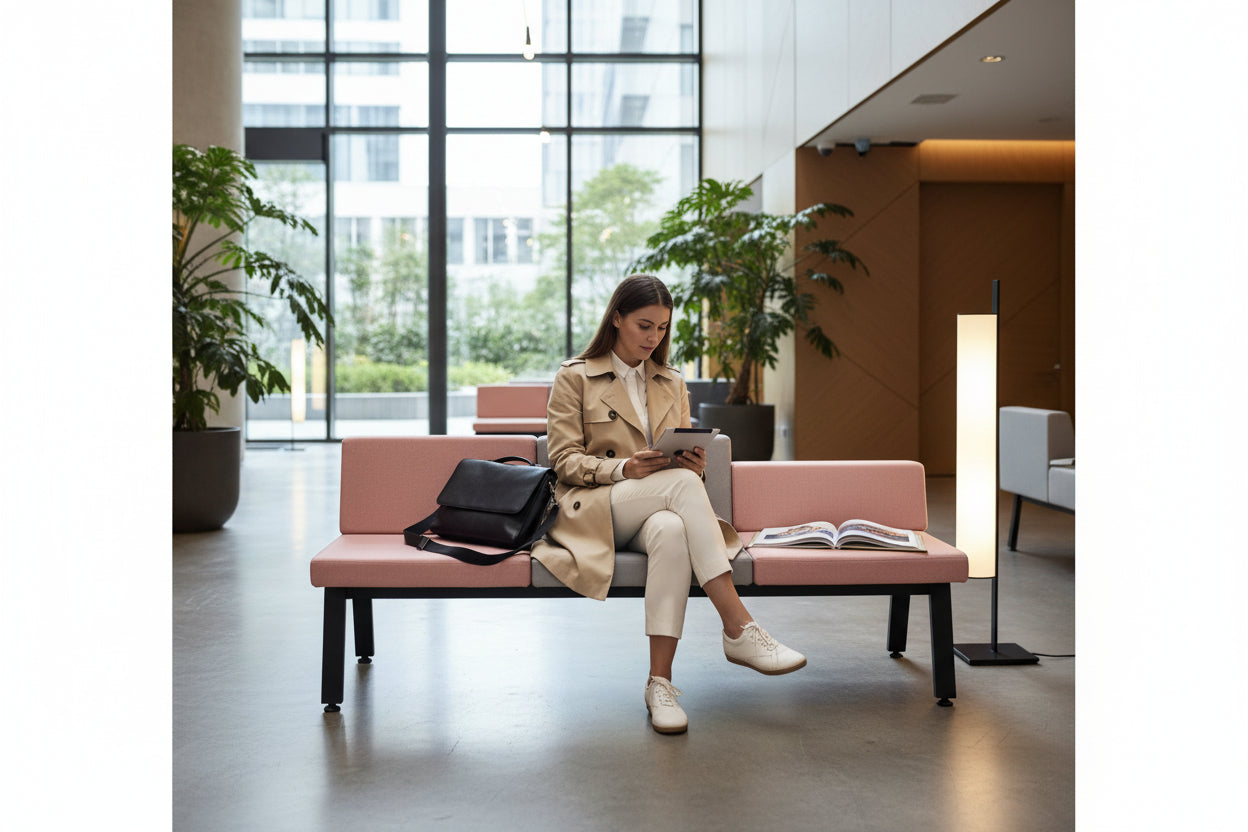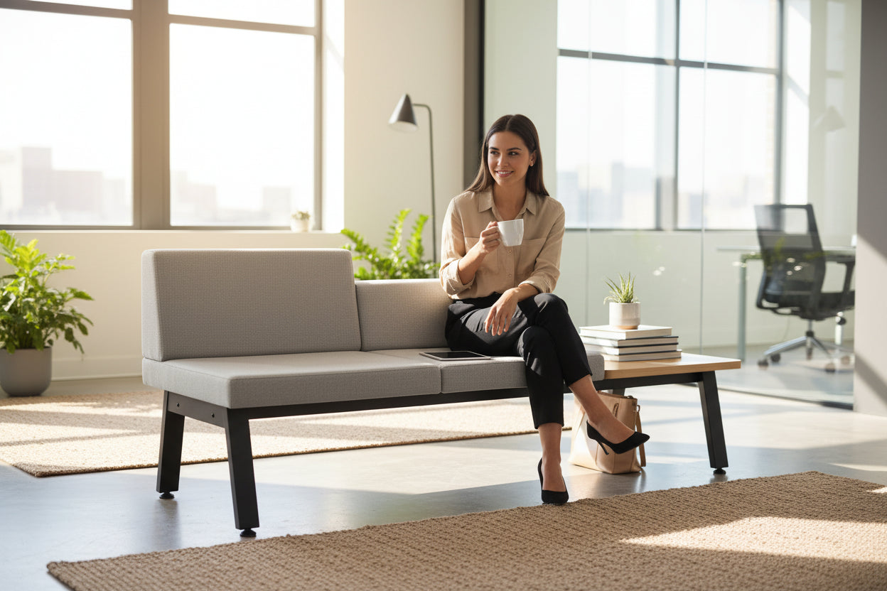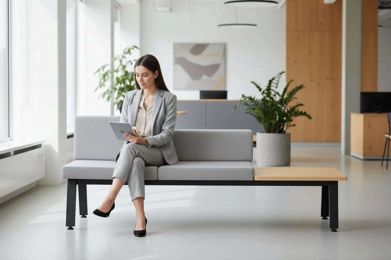 專為現代空間設計的 P SOFA 模組化桌板,具備高度的相容性,能精準嵌入沙發排列,將「休息」與「工作」機能完美整合。