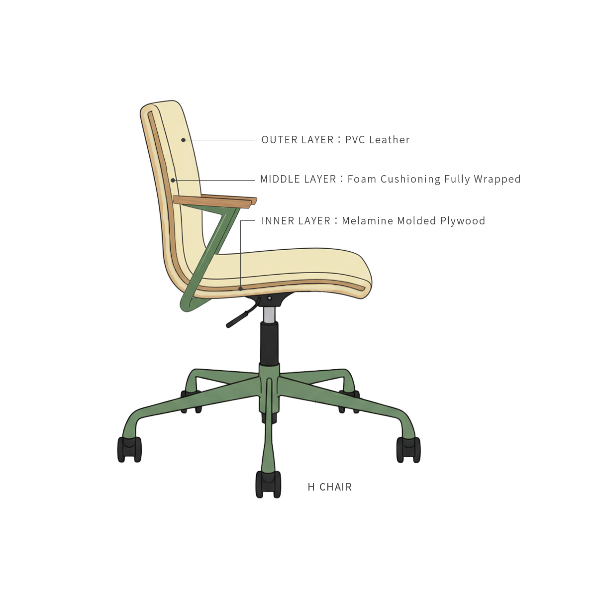 辦公椅為底座旋轉式,高度可自由調整13CM,配有腳輪,可輕易滑動 - 一體成型曲木合板